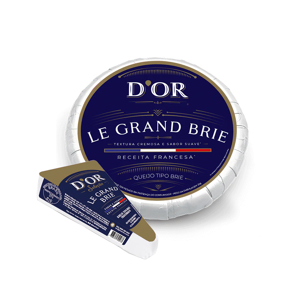 Produzido com a receita original francesa, o Le Grand Brie D’or se destaca por sua alta umidade, que garante um sabor suave e uma textura cremosa que derrete na boca. Este queijo tipo Brie, de massa prensada estabilizada, apresenta uma casca suave e aveludada, aliando cremosidade e intensidade de forma irresistível.