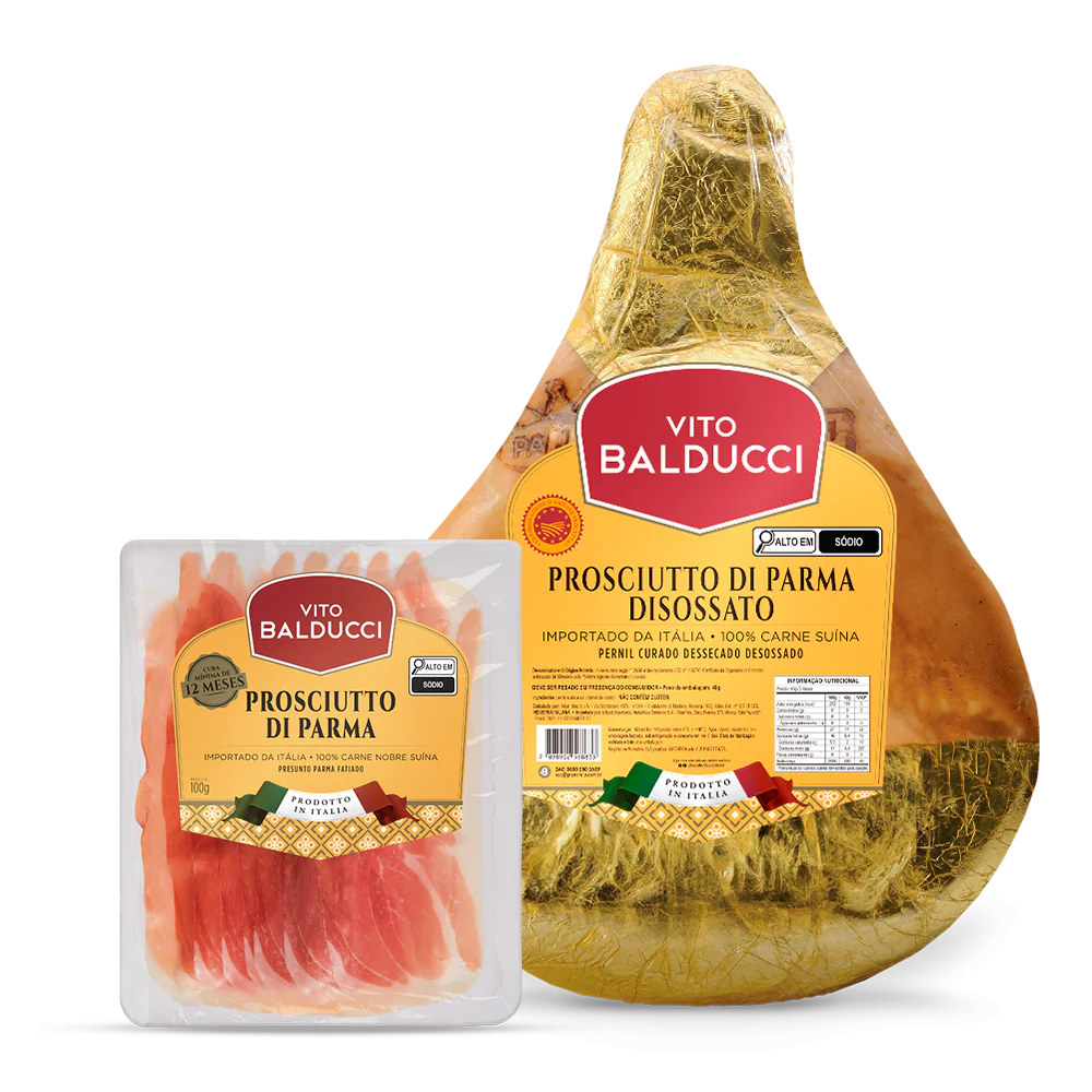 Protegido pelo Consorzio del Prosciutto di Parma, o Presunto Parma é um pernil suíno curado dessecado, de sabor suave e levemente salgado. Sua textura macia e cor avermelhada são características marcantes desse produto tão conhecido mundialmente. Possui selo de Denominação de Origem Protegida (D.O.P), que garante aos consumidores a sua qualidade, origem e segurança no processo de fabricação. Experimente e se impressione!