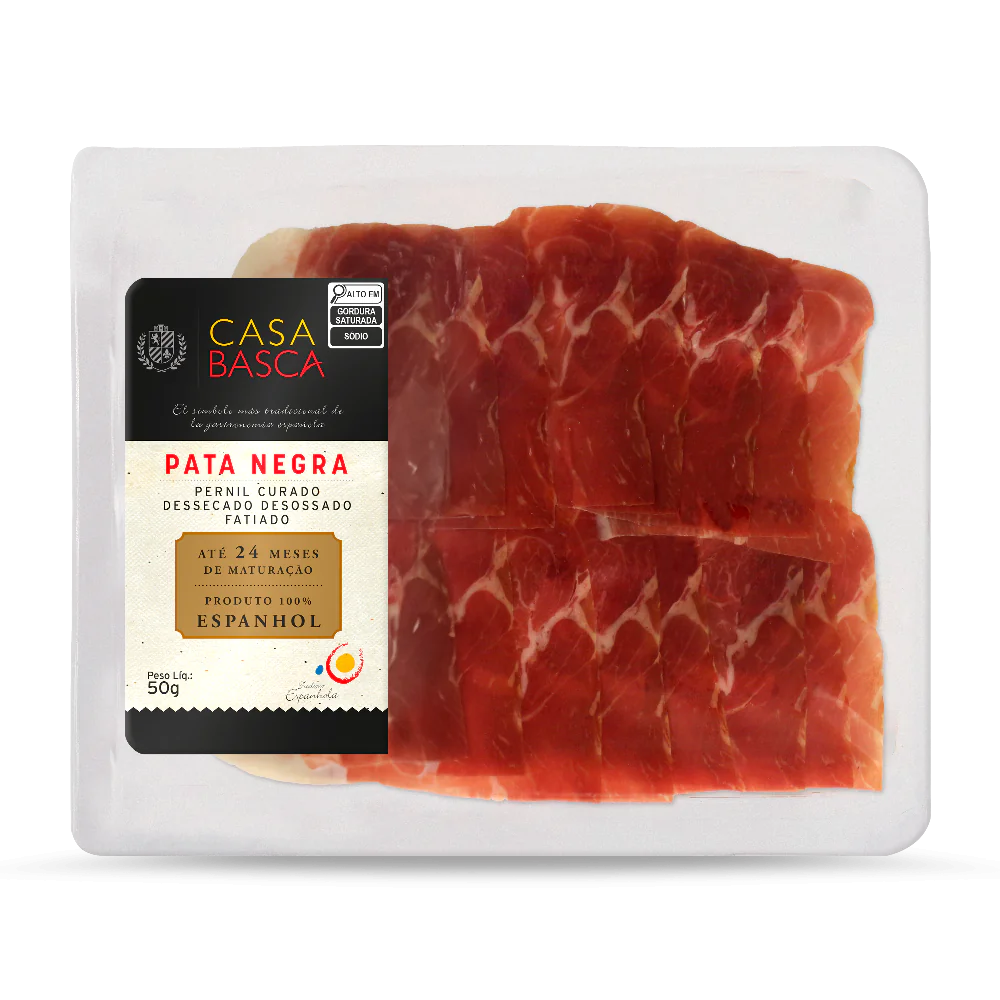 Experimente a tradição espanhola com o Pata Negra. Este pernil curado, dessecado e desossado passa por um processo de fabricação totalmente controlado, desde a escolha da raça dos porcos, peso durante o abate e alimentação, até as condições de cura, que incluem temperatura, umidade, tempo e local. Com um processo de cura de 24 meses, o presunto apresenta uma cor vermelho forte, sabor delicado e salgado, além de uma textura macia. Feito com apenas 2 ingredientes, é um produto natural e saudável, perfeito para aperitivos, tábuas de frios ou acompanhamentos sofisticados!