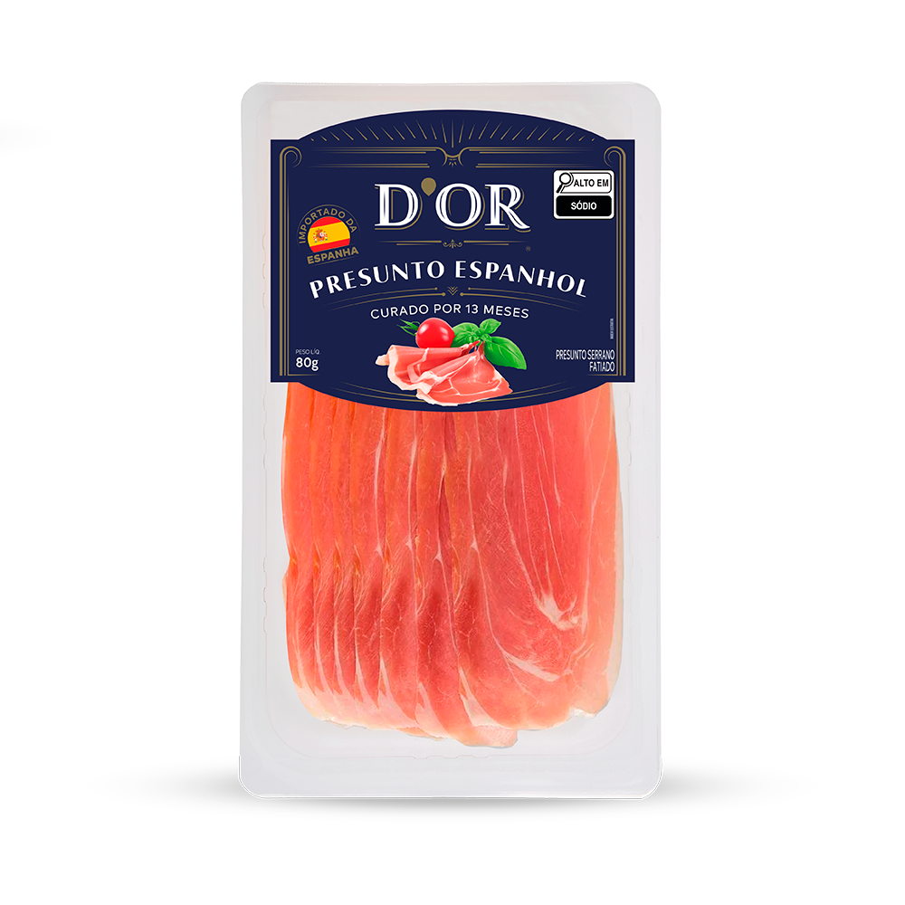 Importado diretamente da Espanha, o Presunto Serrano D’or é o legítimo presunto serrano, curado por 13 meses para alcançar sua textura delicada e sabor inconfundível. Com perfil suave e levemente salgado, é perfeito para compor tábuas de frios, harmonizar com queijos e vinhos ou ser apreciado puro, em sua forma mais autêntica.