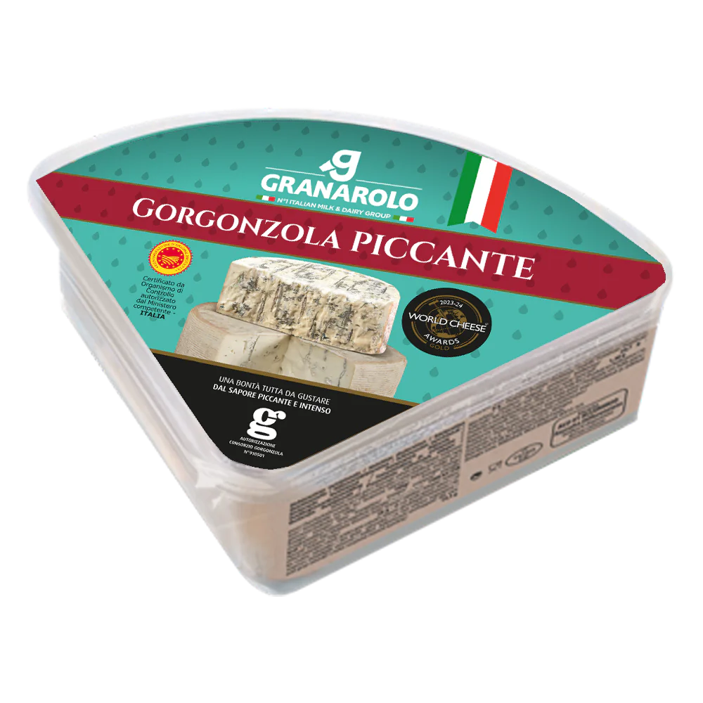 O Gorgonzola Piccante D.O.P. é um tradicional queijo azul italiano, produzido com leite integral pasteurizado de vaca e maturado por 3 a 4 meses. Possui massa firme e cremosa, de coloração amarelo-palha, marcada por veios azul-esverdeados intensos e bem distribuídos, formados naturalmente durante o processo de marmoreio com culturas de Penicillium.