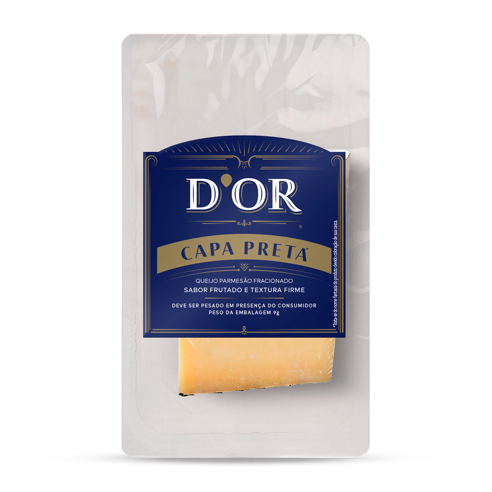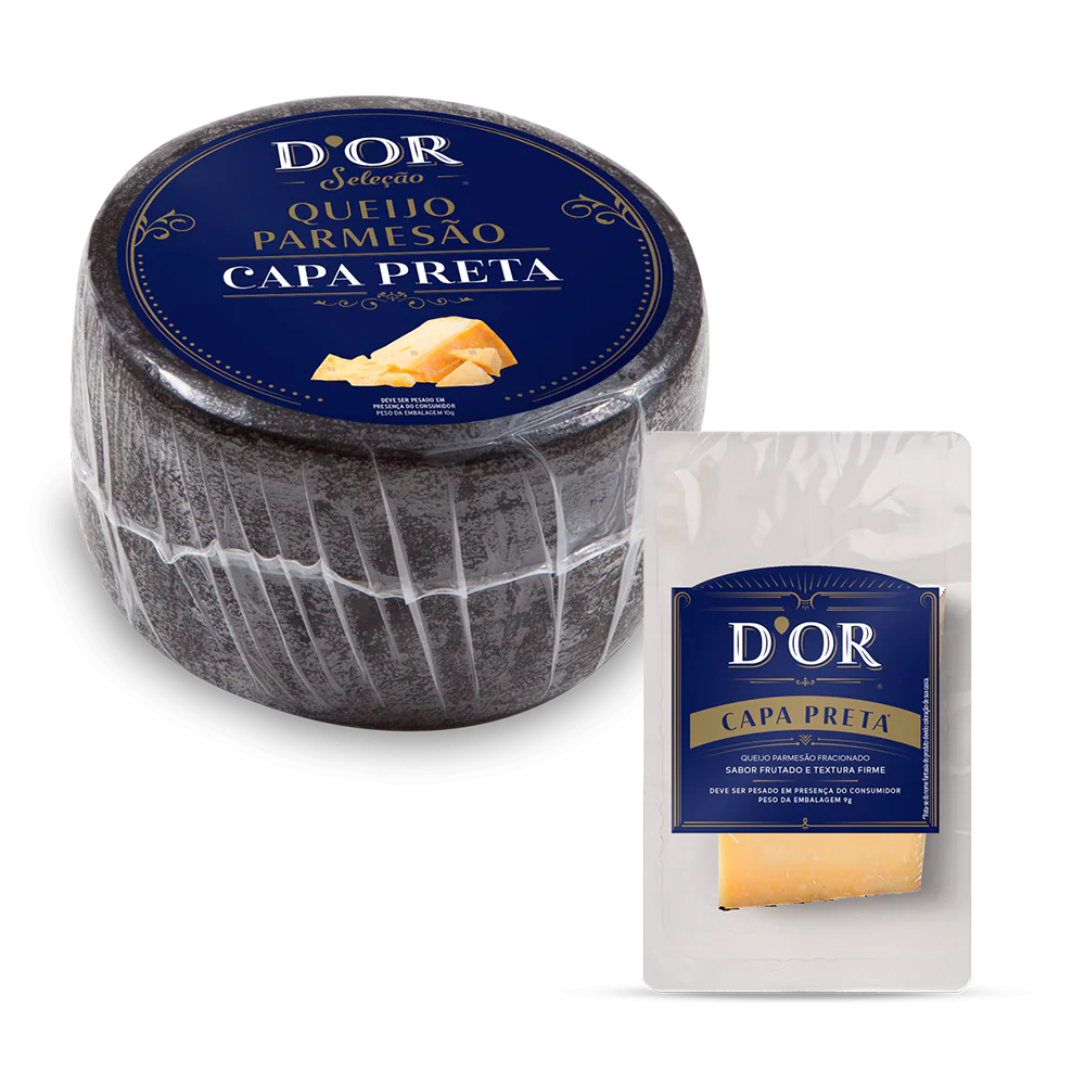 Maturado por 36 semanas, o Parmesão Capa Preta D’or entrega um sabor intenso e marcante, levemente picante, com textura quebradiça e cor amarelada característica. Sua tradicional capa preta protege o queijo, preservando sua intensidade e garantindo uma experiência autêntica a cada pedaço.
