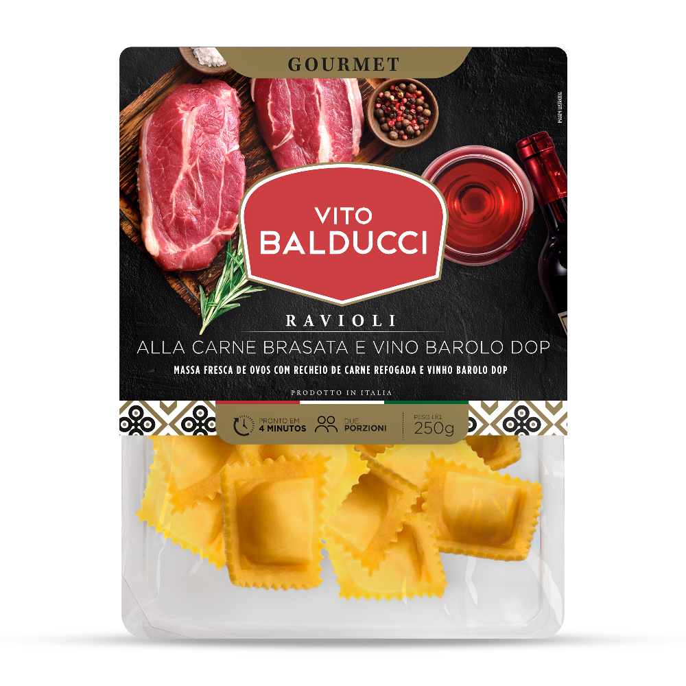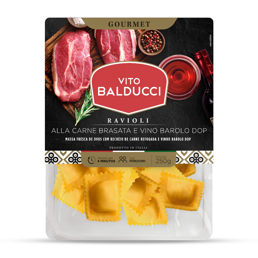 Recheio: carne refogada (carne bovina 60%, carne suína 30%, cebola, cenoura, alho, alecrim, noz-moscada e vinho tinto), queijo ralado (leite, sal e coalho), farinha de rosca (farinha de trigo mole, levedura de cerveja e sal), farinha de trigo mole, batata desidratada, soro de leite em pó, óleo de girassol, vinho Barolo DOP, queijo Emmental (leite, sal e coalho), sal (cloreto de sódio) e noz-moscada.